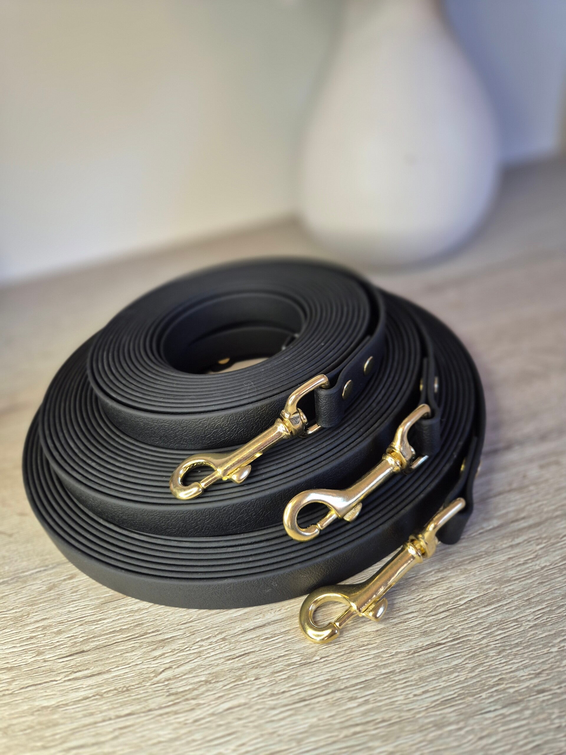 Ce type de sangle possède les mêmes qualités techniques que le Biothane® (matériau reconnu mondialement) : résistante à la traction, aux coupures, à l’abrasion, imperméable, inodore, facile à nettoyer, et respectueuse de la peau de vos compagnons. La sangle que nous utilisons est légèrement plus rigide que le Biothane®, ce qui peut offrir une meilleure prise en main, notamment lors des séances de travail ou d’éducation.